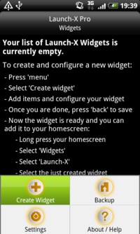 In the Launch-X application you can create/edit/delete widgets by using the Widget Editor. Once you are done configuring your widget, you can add it to your homescreen as you would do with any other widget (long-press your homescreen, select 'Widgets', and then 'Launch-X').