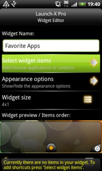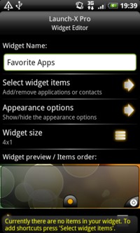 In the new screen (the 'Widget Items Editor') you can add items to the widget: applications, contacts or generic shortcuts.