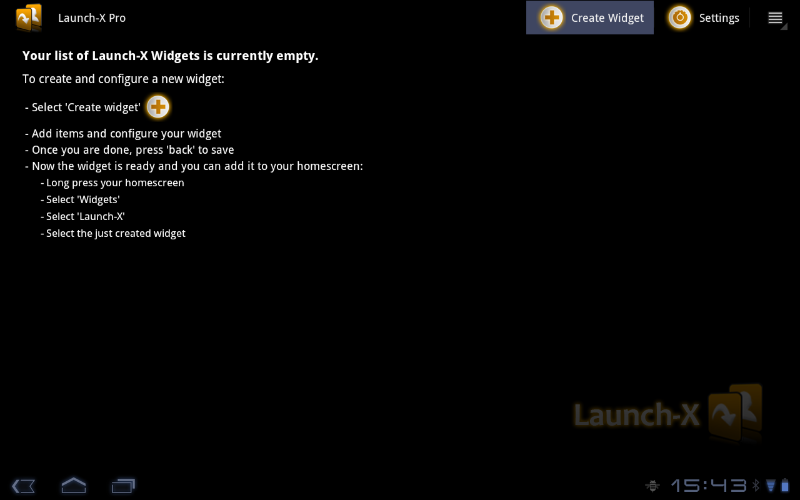 In the Launch-X application you can create/edit/delete widgets by using the Widget Editor. Once you are done configuring your widget, you can add it to your homescreen as you would do with any other widget (long-press your homescreen, select 'Widgets', and then 'Launch-X').