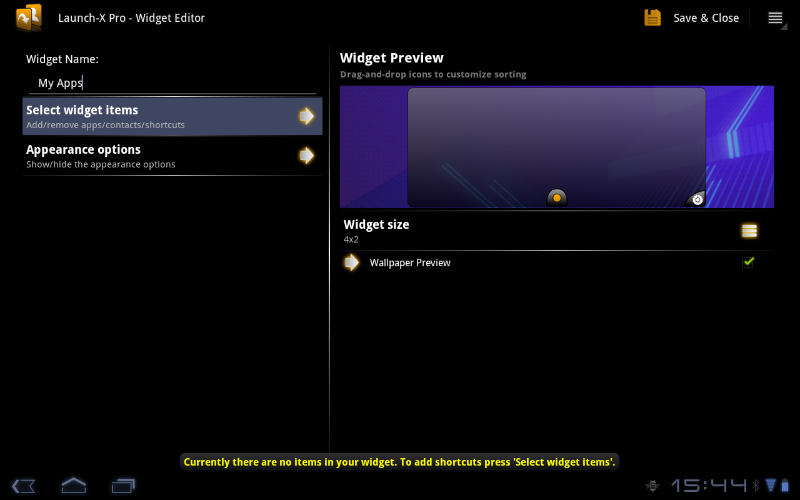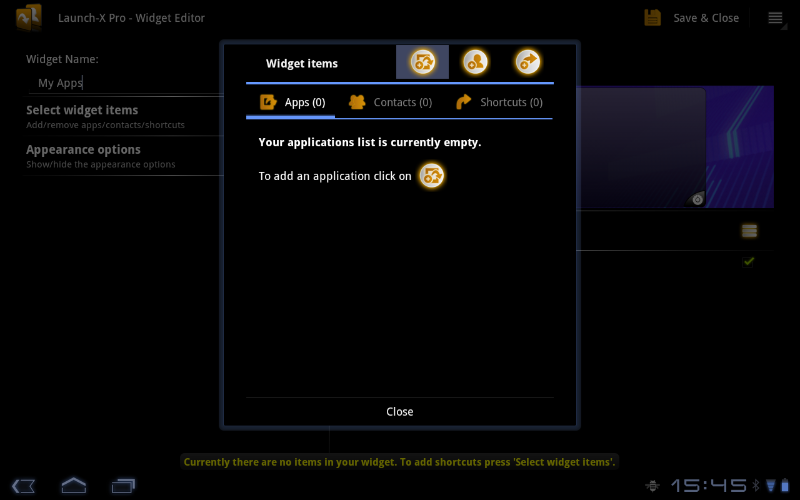 In the new screen (the 'Widget Items Editor') you can add items to the widget: applications, contacts or generic shortcuts.