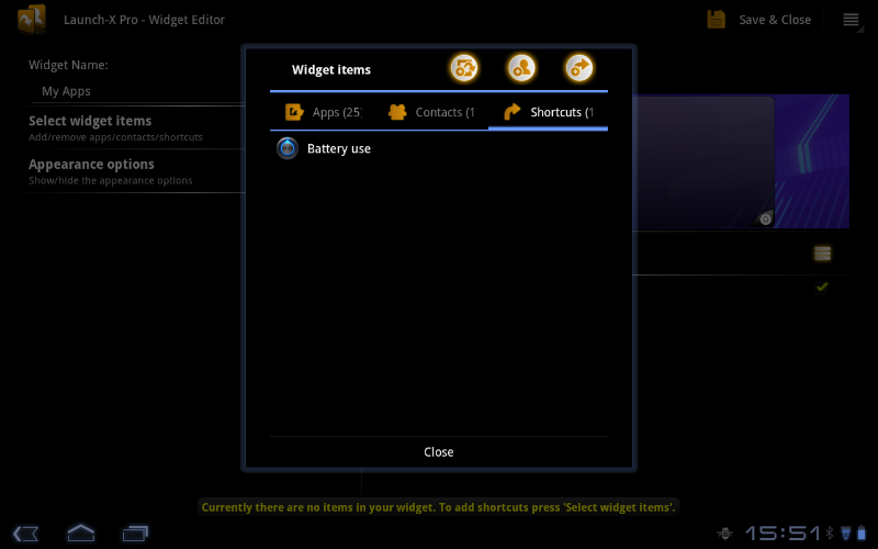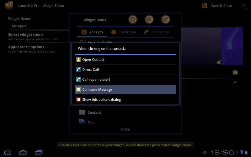 Let's see, step-by-step, how to create a Launch-X widget, add some items (applications, contacts and generic shortcuts) to it, customize the widget, and finally add it to the homescreen.