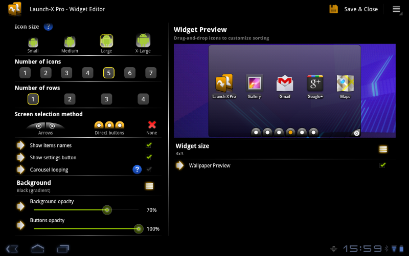- Icon size Select your preferred icon size (among 'Small', 'Medium', 'Large' and 'X-Large'). Please note that the actual size of the icons might shrink depending on the other widget's configurations. For example, if you create a 3x1 widget with 7 large icons per row the real size will be smaller to fit the items.